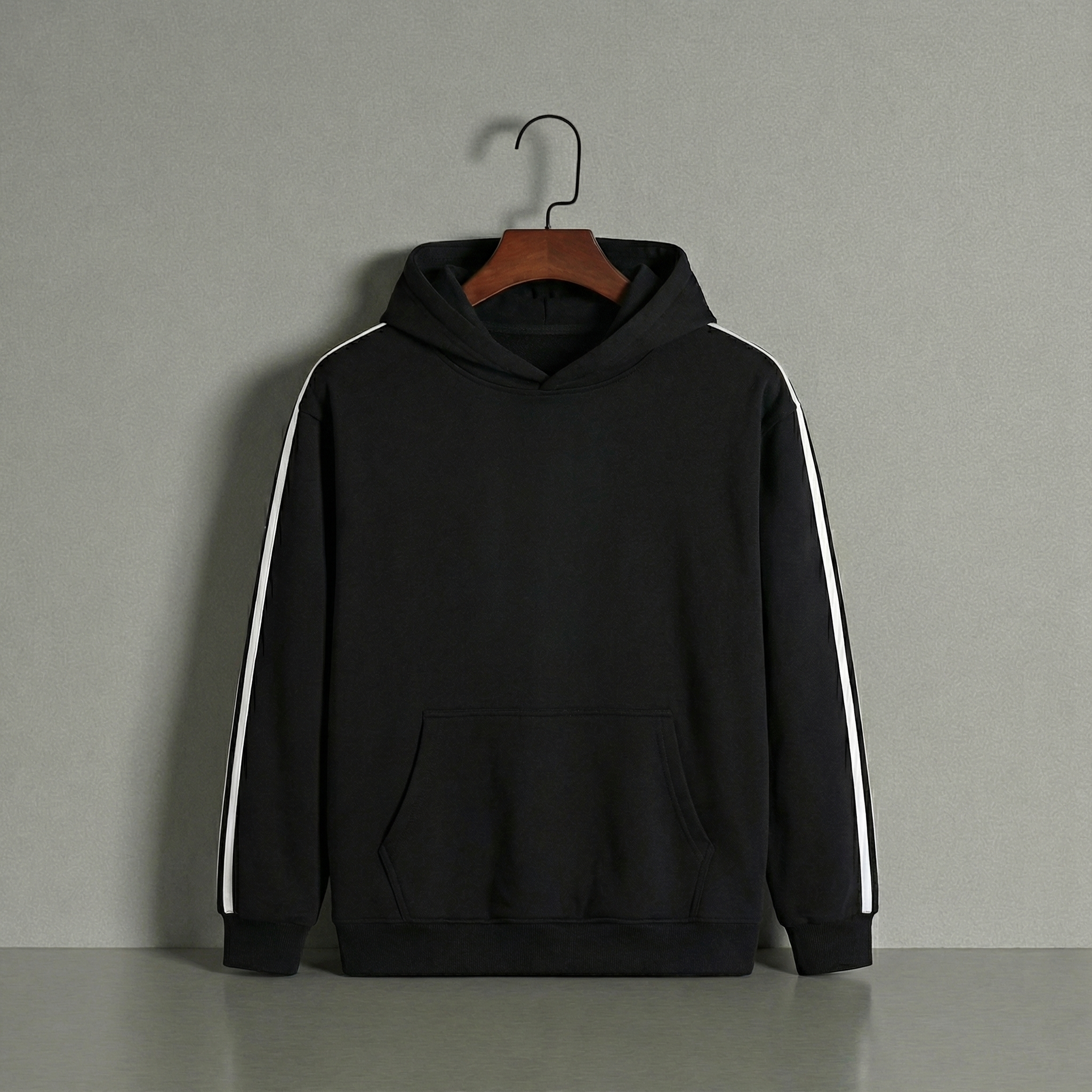 Classic black pullover hoodie for men. Features a comfortable fit, kangaroo pocket, and white double stripes on the sleeves.