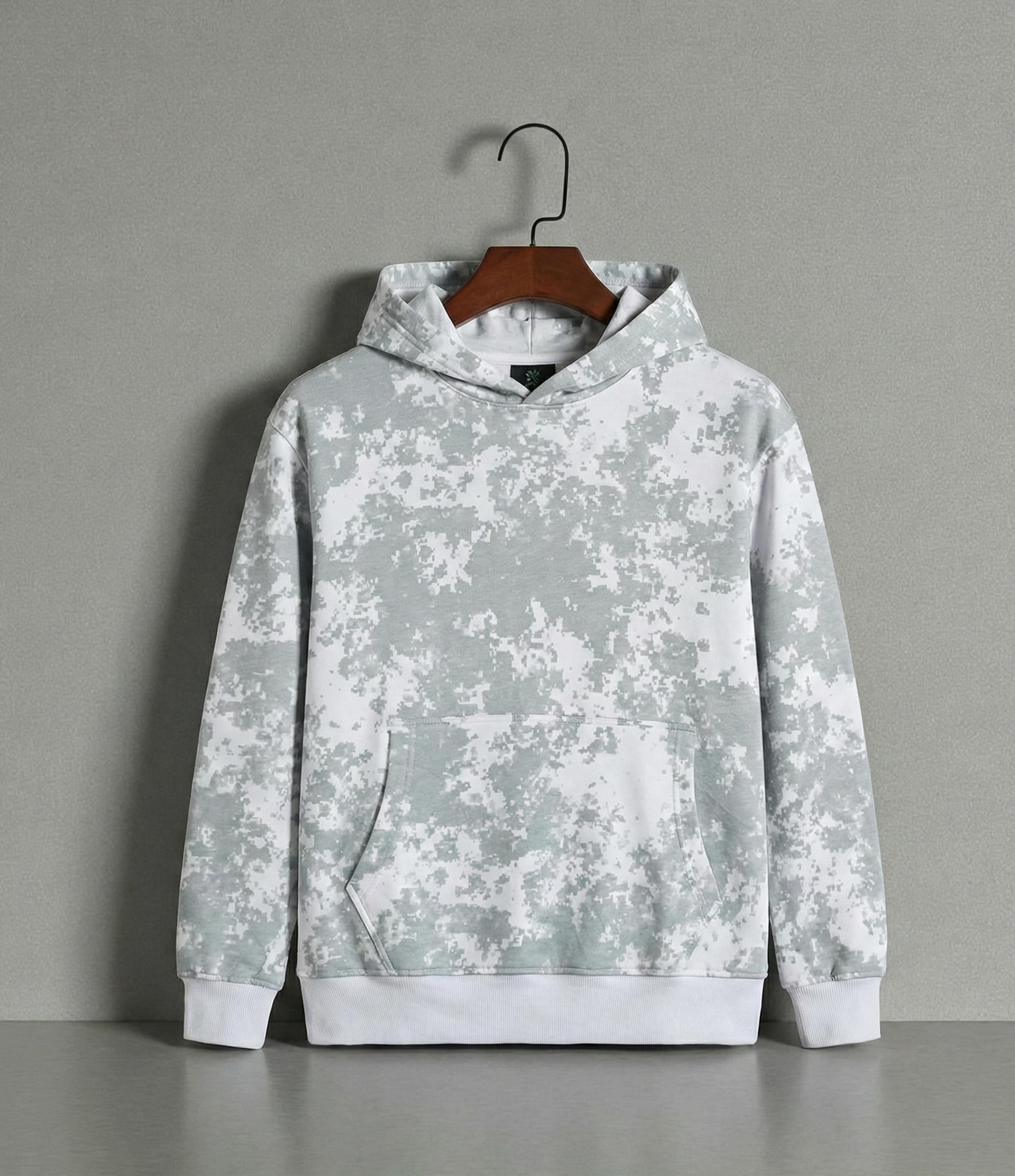 Men’s pullover hoodie with a modern light gray and white digital camouflage pattern. Features a comfortable fit and kangaroo pocket.
