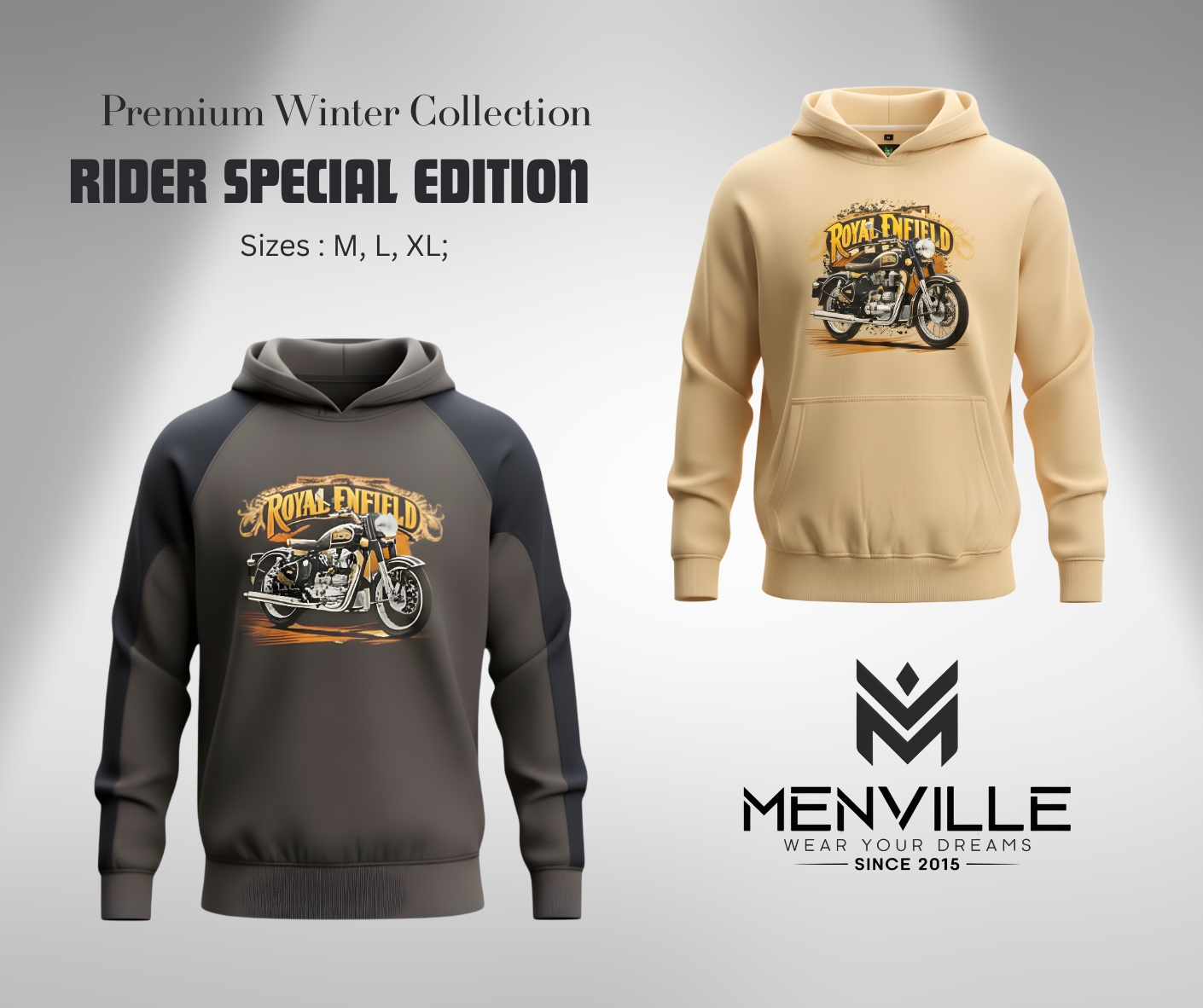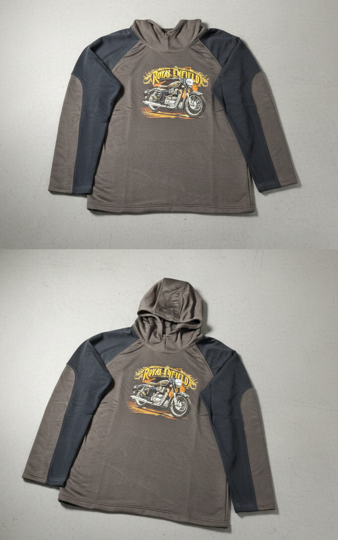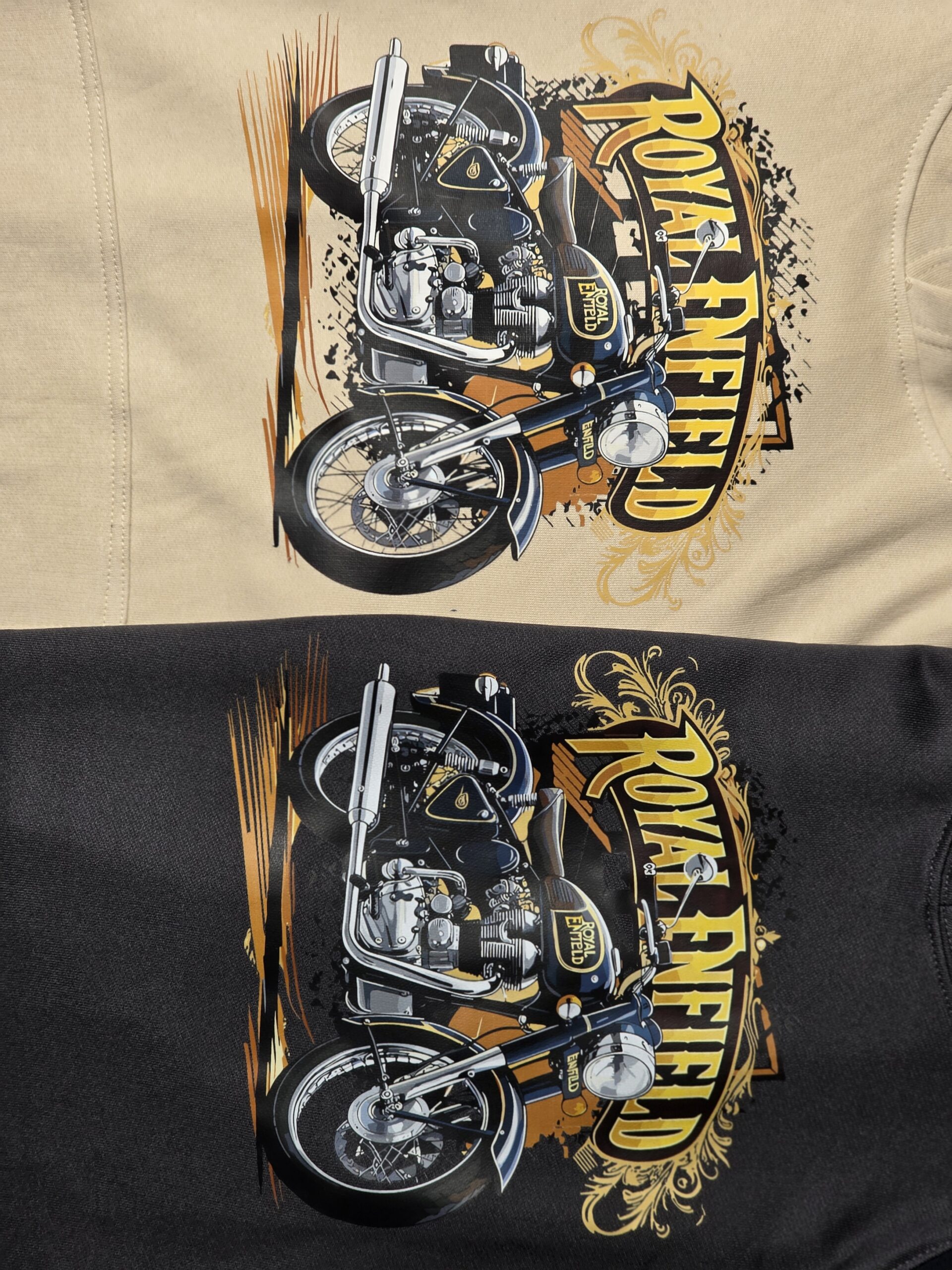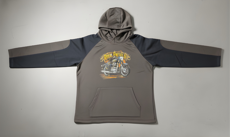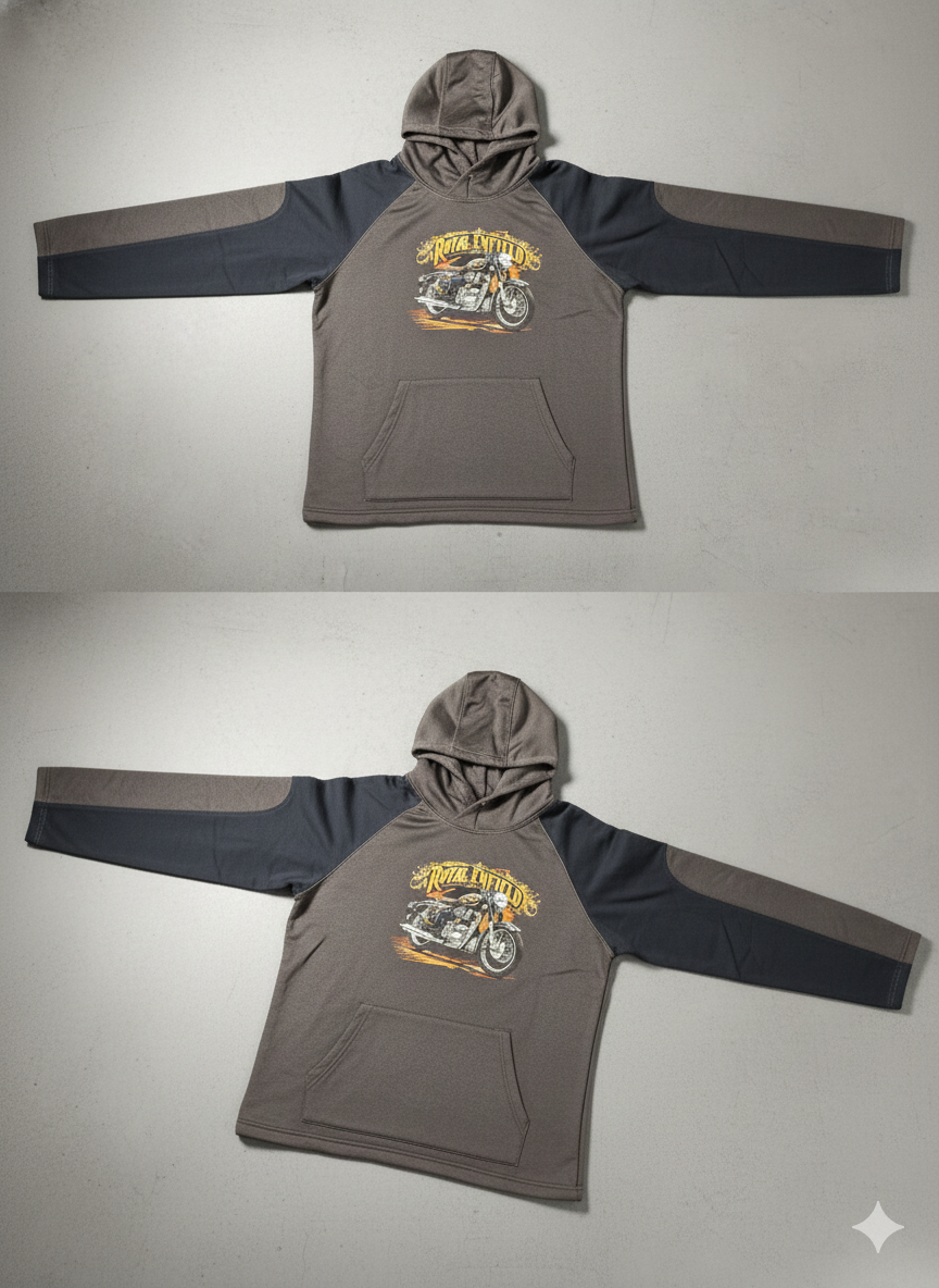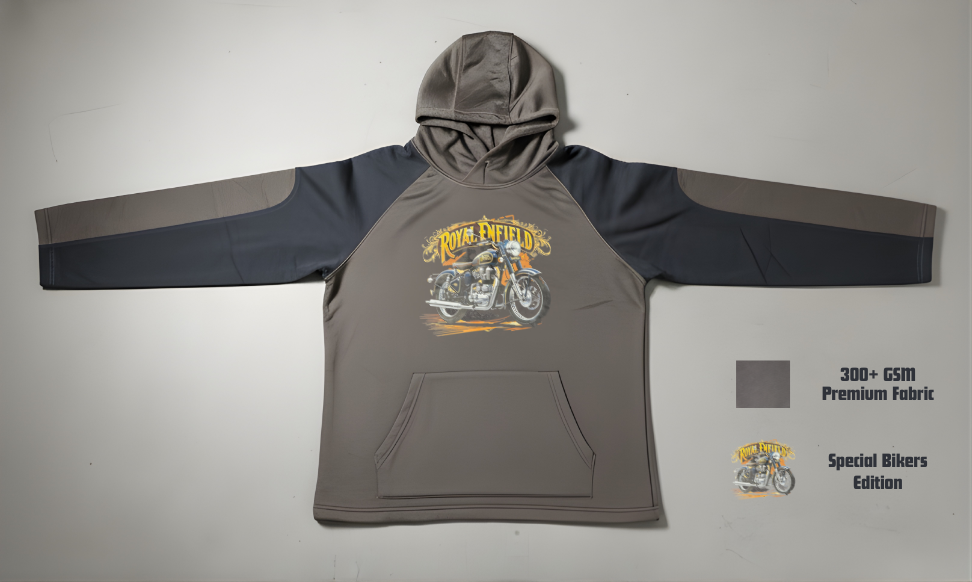 Premium two-tone gray and black raglan hoodie featuring a bold Royal Enfield motorcycle graphic. Perfect hooded sweatshirt for bikers.